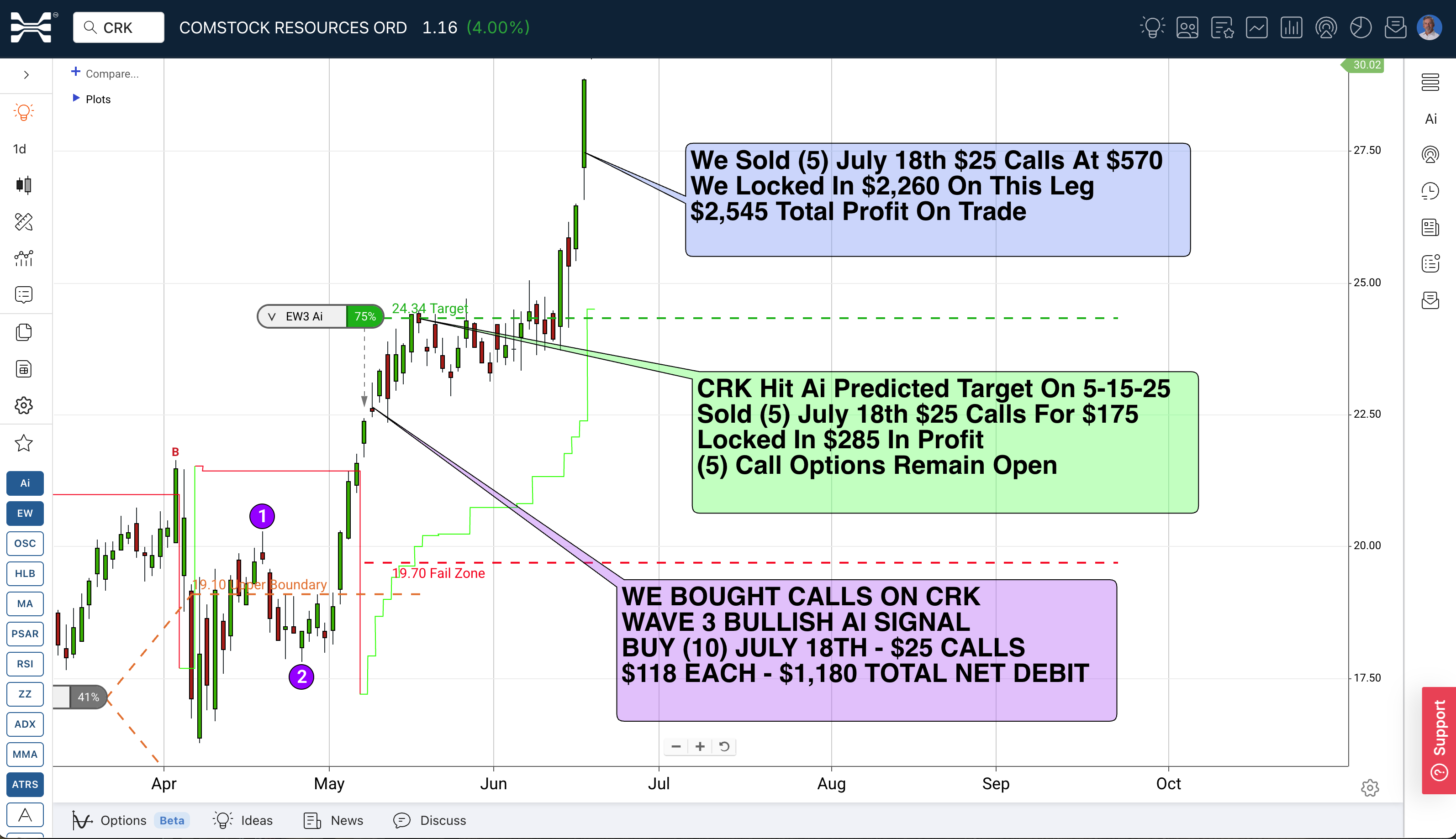 This trade on Comstock Resources (CRK) shows exactly how HUBB AI Concierge PRO works in practice. The system identified a bullish setup with a confidence score above 75, guided the entry, then managed the trade with a partial exit at the AI target and a final exit using a trailing stop