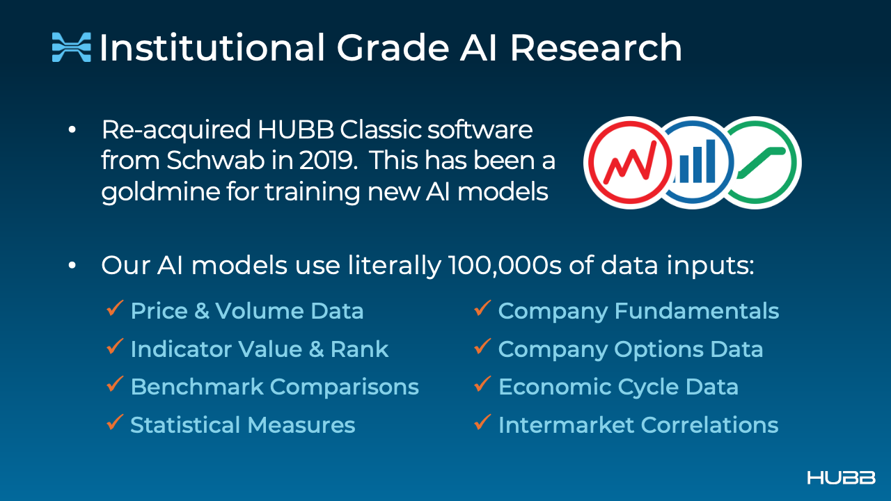 HUBB AI is built on the kind of advanced infrastructure typically reserved for institutional trading desks—not the kind of technology most independent traders can build or maintain. It draws on deep market data, complex algorithms, and cloud-based computing power to generate real-time signals using hundreds of thousands of inputs. Most private traders simply don’t have the data access, AI programming expertise, or computing scale to create anything like it. HUBB makes this institutional-level power accessible.