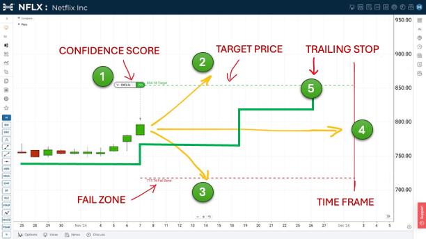 Every trade in HUBB AI Concierge PRO follows a clear, rules-based process. We only enter trades with a confidence score above 75 (Point 1), giving you higher probability setups from the start. At the target price (Point 2), we take partial profits off the table — locking in gains early. However, instead of exiting completely, a trailing stop (Point 5). This allows you to stay in the position as long as it’s moving higher, capturing bigger moves while protecting profits.